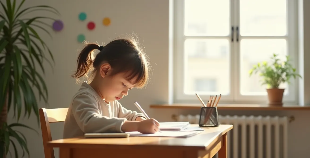 Créer une « bulle de silence » ne signifie pas vivre dans une maison aseptisée. Il s’agit de définir des zones et des moments « sacrés ». L’espace de devoirs, par exemple, doit être visuellement épuré : seuls les outils nécessaires sont sur la table. Le reste est rangé. Pendant les périodes de concentration, la télévision est éteinte, les notifications des téléphones des parents sont en mode silencieux. Vous montrez ainsi par l’exemple que l’attention est une ressource précieuse qui mérite d’être protégée collectivement.